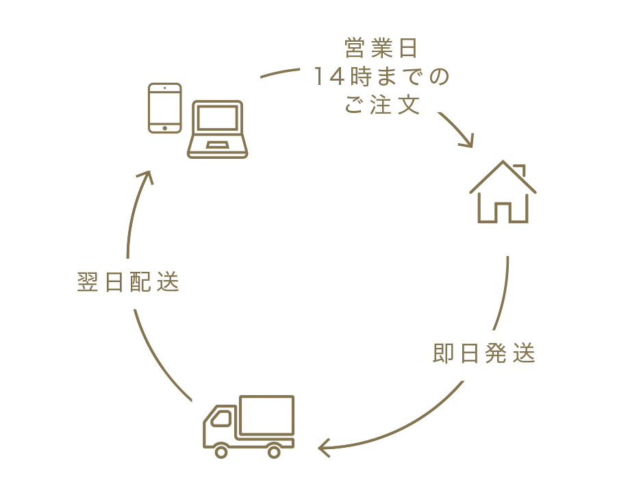 *1 一部商品、また日曜・祭日・当店指定定休日・その他長期休暇期間を除きます。配送日は一般的な配送日を示した目安であり、配送日を保証するものではございません。悪天候等による交通機関の影響や、交通困難地については配送が遅れる場合がございます。予めご了承いただけますようお願い申し上げます。