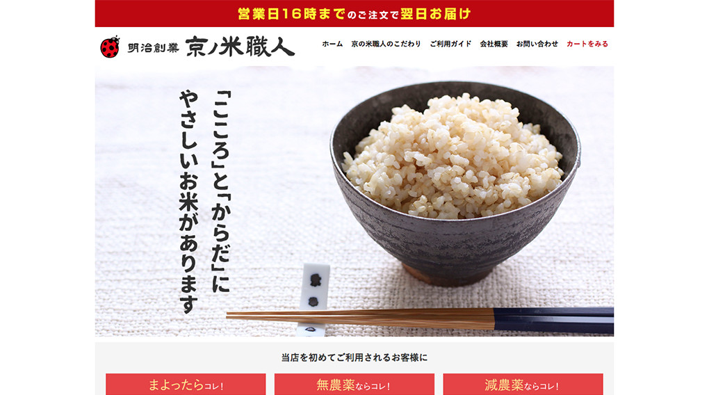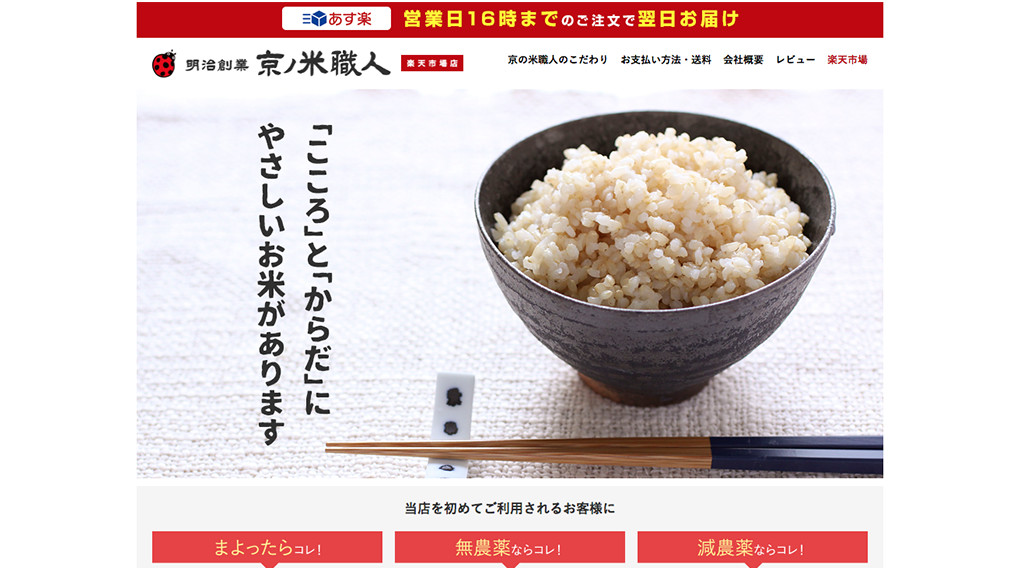 京の米職人のオンラインショップは、自社ショップ、楽天市場店、Yahoo!ショッピング店、Amazon店があります。いずれのショップでも、営業日14時までのご注文で翌日配達。*1 急にお米がなくなったときでも、ご近所使いのお店のように、安心・安全なお米をお取り寄せいただけます。